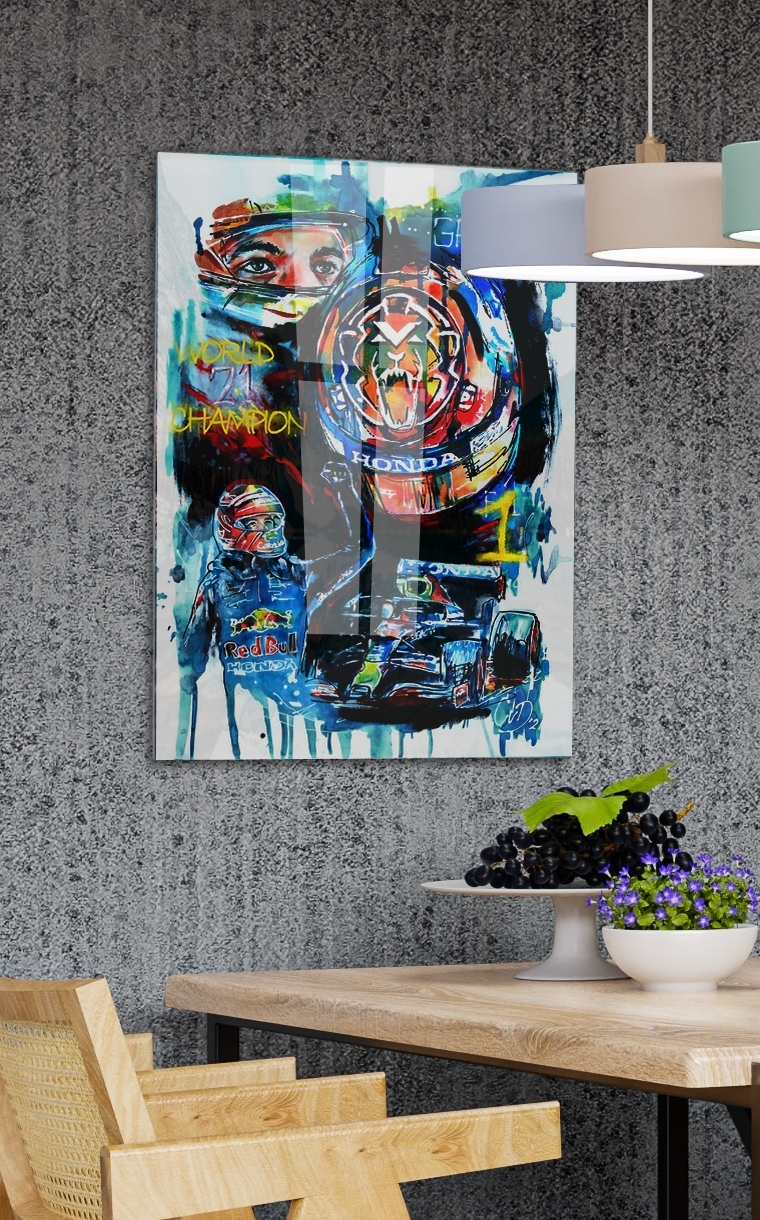 Kunstdruk mixed media: acryl, inkt, aquarel door Carroline van Dijk, als eerbetoon aan de fantastische Max Verstappen, wereldkampioen Formule 1 coureur!
